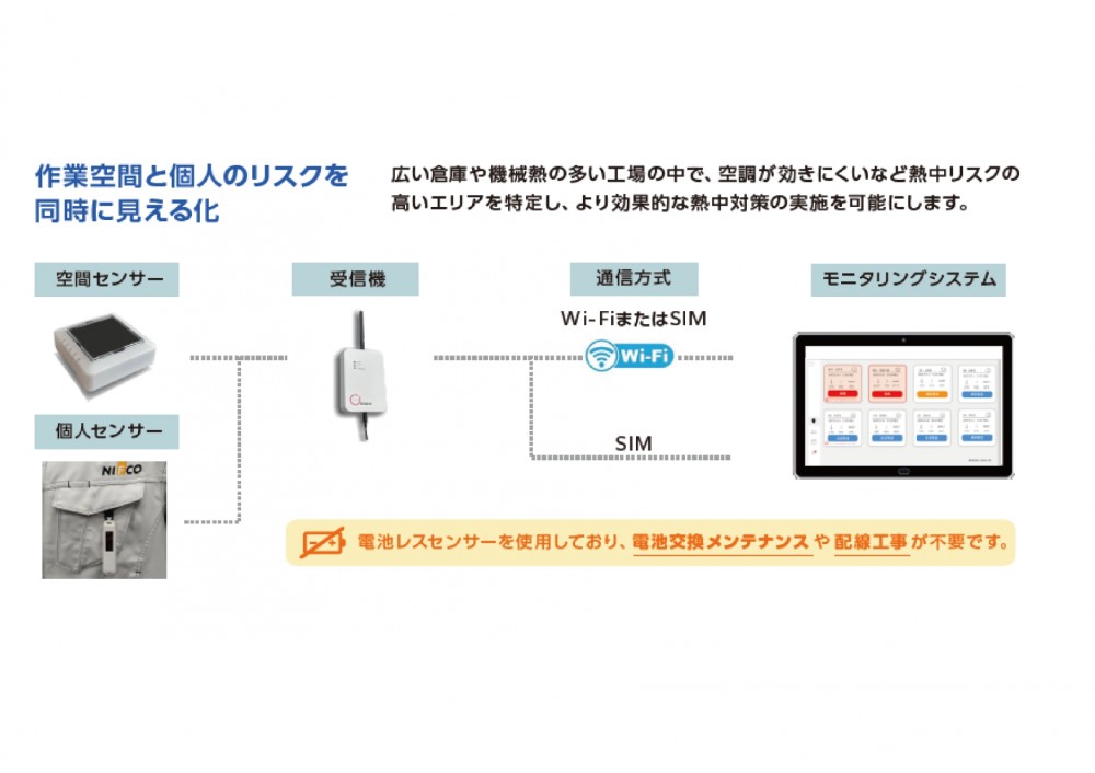 2025年安衛則改正に対応で、センサーで個人とエリアの熱中症リスクを5段階でリアルタイムで可視化できます。